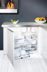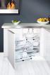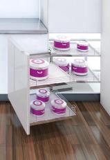 W tym samym czasie tylne kosze przesuwają się w bok, co ułatwia korzystanie z tylnej, trudno dostępnej części szafki narożnikowej. System jest przeznaczony do szafek o szerokości frontu 400 mm, 450 mm,500 mm, 600 mm i występuje w dwóch opcjach montażu : kosze wysuwają się na prawą , lub lewą stronę . Do wyboru jest kilka lini koszy: