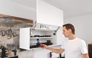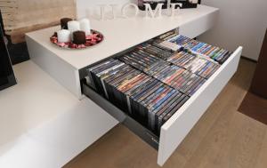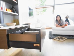 Przykłady zastosowania okuć i wyposażenia mebli w pokoju dziennym.
