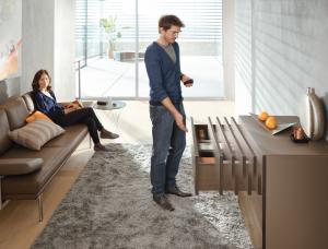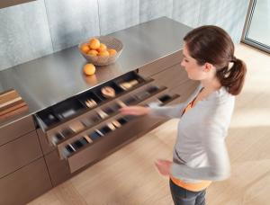 TIP-ON BLUMOTION do LEBRABOX łączy w sobie zalety mechanicznego wspomagania otwierania TIP-ON ze sprawdzonym systemem hamowania BLUMOTION, który dba o delikatne i ciche zamykanie. Umożliwia otwieranie poprzez lekkie naciśnięcie powierzchni frontu, oraz delikatne i ciche zamykanie poprzez popchnięcie szuflady. Funkcjonalność, która do tej pory dostępna była wyłącznie przy zastosowaniu SERVO- DRIVE, tutaj realizowana jest w 100 %mechanicznie. Duży obszar aktywacji na powierzchni frontu, powiększany dodatkowo przez opcjonalną synchronizację sprawia, że TIP-ON BLUMOTION oferuje zachwycający komfort obsługi szuflad bez uchwytów nawet przy wyjątkowo wysokich i szerokich frontach. TIP-ON BLUMOTION można zastosować również przy niewielkiej szczelinie frontu wynoszącej 2.5 mm, co sprawia, że jest on idealnym rozwiązaniem do każdego rodzaju mebli: poczynając od kuchennych, poprzez łazienkowe czy pokojowe, a kończąc na meblach do garderoby lub biura. W odróżnieniu od dotychczasowego systemu TIP-ON możliwe jest jego stosowanie również w meblach wyposażonych w uchwyty, ponieważ otwieranie go przez pociągnięcie jest równie właściwym sposobem jego otwierania jak naciśnięcie.