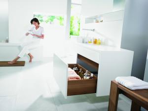 Wałki z tworzywa odpornego na zużycie gwarantują płynny ruch, a niskie wartości opadania pozwalają na realizację szuflad nisko nad podłogą. Opcjonalna stabilizacja boczna zapewnia niezwykle równą i płynną pracę całej szuflady w korpusach o szerokości dochodzącej nawet do 120 cm.