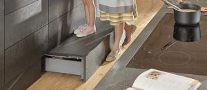 SPACE STEP to rozwiązanie cokołowe mające ułatwić dostęp od szafek górnych oraz umożliwić dzieciom dostęp do blatu roboczego lub zlewozmywaka, a także pozwala wykorzystac dotychczas nie używaną przestrzeń za cokołem do powiększenia powierzchni magazynowania.