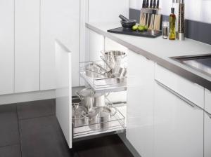 Pod tą nazwą kryją się dwa kosze pierwszy to kosz zewnętrzny który jest pojedynczym elementem, mocowanym do frontu ,wysuwa się on przy otwieraniu szafki, oraz kosz wewnętrzny mocowany do boków szafki, ten kosz możemy wysuwać samodzielmnie z szafki. Materiał zastosowanych w konstrukcji oraz chromowana powierzchnia, w połączeniu z nowoczesną techniką wykonania dają solidny produkt. Kosze chromowane to klasyczne, od dawna sprawdzające się rozwiązanie. Ich największe zalety to odporność na uszkodzenia i zabrudzenia oraz dobra widoczność zawartości.