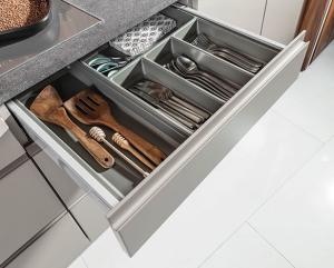 Wkład SKY zapewnia wygodne przechowywanie sztućców, drobnych akcesorii i łyżek o nietypowych rozmiarach. ze względu na wysokie i szerokie przegrody wewnetrzne wkłady te są bardzo pojemne. W duzych komorach możliwe jest zastosowanie dodatkowych podziałek, co zapewnia większą elastycznośc w organizacji wnętrza szuflad.Wkład występuje w dwóch kolorach : antracyt i brunatnoszarym.