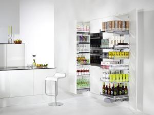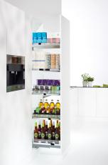 CONVOY Centro to ekskluzywne rozwiązanie dla zabudowy wysokiej typu cargo, które gwarantuje błyskawiczny wgląd do wnętrza szafki, przejrzystość przechowywania i łatwy dostęp do zawartości z dwóch stron. System zapewnia mnóstwo przestrzeni na produkty suche i umożliwia optymalne jej wykorzystanie. Innowacyjny sposób mocowania półek na pojedynczej ramie, pozwala na płynną regulację i dopasowanie ich rozmieszczenia do wielkości przechowywanych produktów. Wyjmowane ścianki boczne ułatwiają wkładanie i wyjmowanie większych przedmiotów.